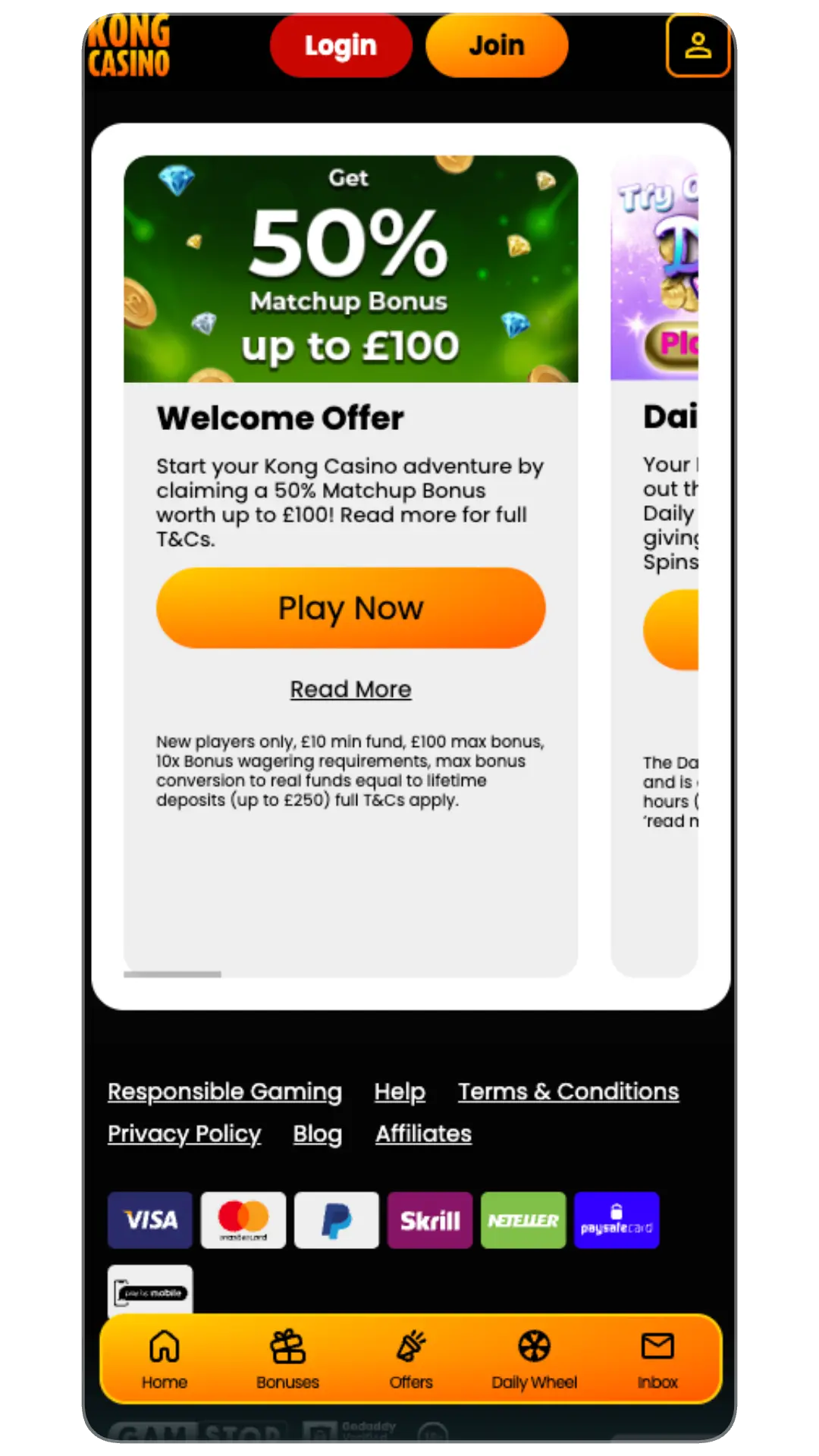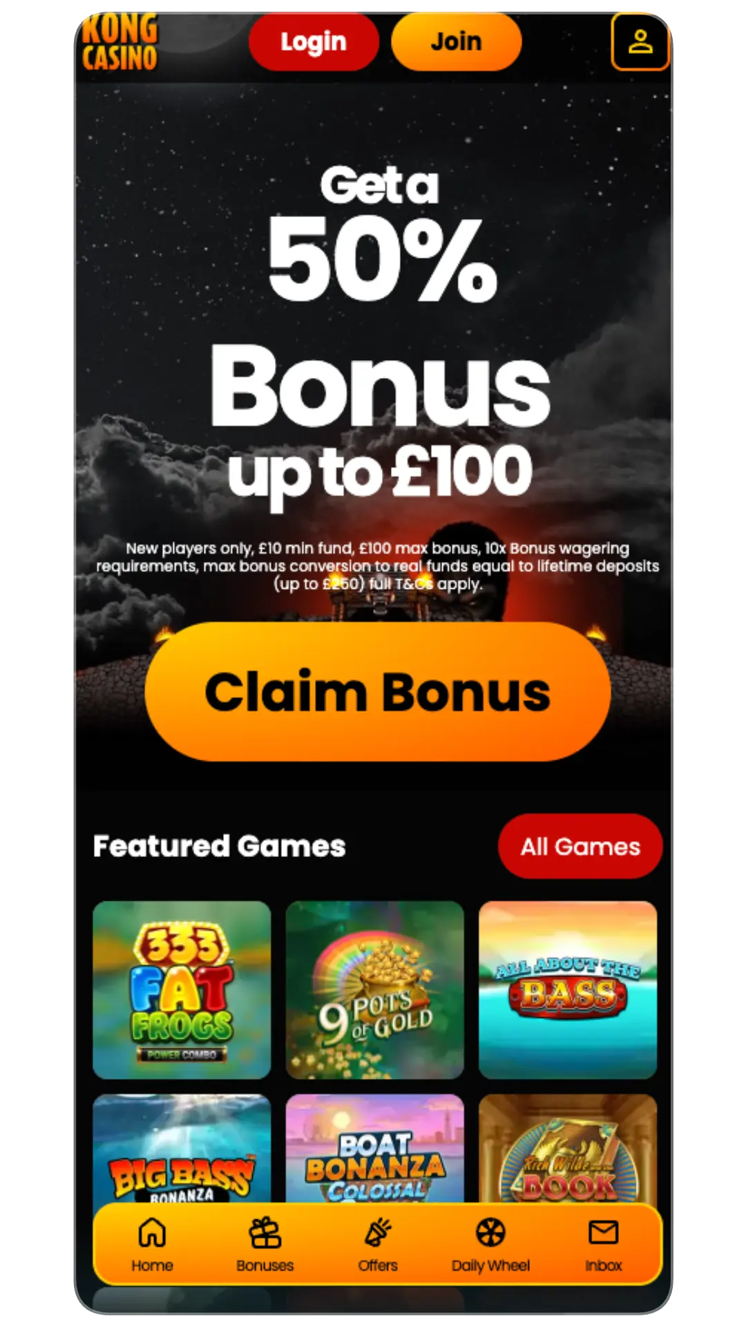 - First deposit bonus: New players who create their account on the casino Kong app can claim the first deposit offer. You cannot get it if you have already signed up on your desktop or browser and claimed it.