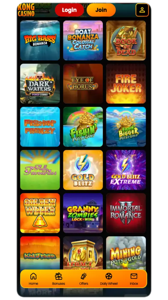 The Kong Casino mobile app is designed with all casino features, including navigation buttons and games. They are the same features you can find on the desktop version, in addition to push notifications: